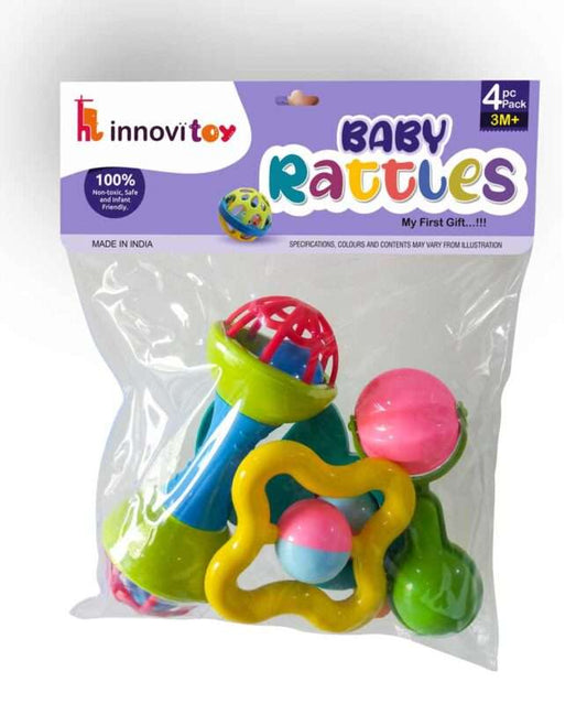 4-Piece Baby Rattle Set – Safe, Colorful & Non-Toxic Rattles for Teething, Grasping & Sensory Play | Soft & Chewable Toys for Newborns & Infants | Ideal Gift for Babies (Pack of 4)