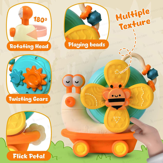 DN TOYS 5 Modes of Play Snail Spinner Toy for Baby 0-3 Years | Convertible Friction Powered Car with Suction Cup Base, Montessori Sensory, Educational Gift Set for Kids Baby